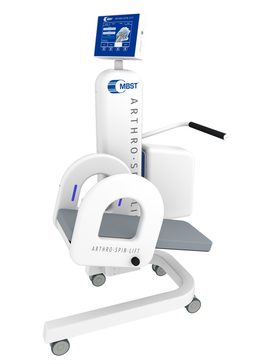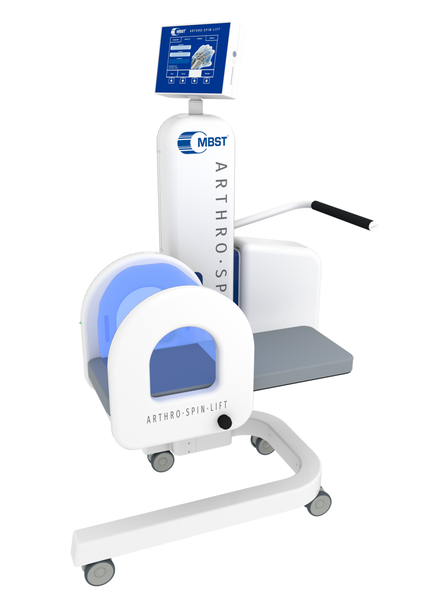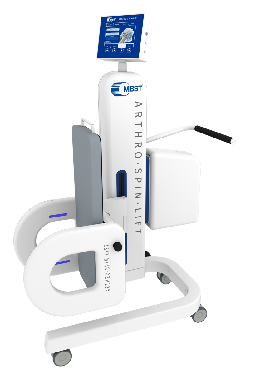 Het ARTHRO-SPIN-LIFT Therapieapparaat betreft hoogwaardige medische technologie. Het MBST-Therapieapparaat combineert therapeutische effectiviteit en patiëntcomfort met een uniek design en overtuigt ook in de dagelijkse praktijk door zijn functionaliteit, gebruiksvriendelijkheid, esthetiek en hygiënische aspecten. Met zijn brede scala aan te behandelen indicaties zet ARTHRO-SPIN-LIFT nieuwe maatstaven. Het therapiesysteem maakt een betrouwbare, behoedzame en veilige behandeling van een groot aantal degeneratieve aandoeningen en verwondingen van het bewegingsapparaat mogelijk. Bovendien wordt het gebruikt bij aandoeningen van het botmetabolisme en om genezingsprocessen te versnellen. Dit maakt het een ideale aanvulling op postoperatieve, post-intramurale en revalidatie-begeleidende behandelstrategieën voor verwondingen en aandoeningen van het bewegingsapparaat.