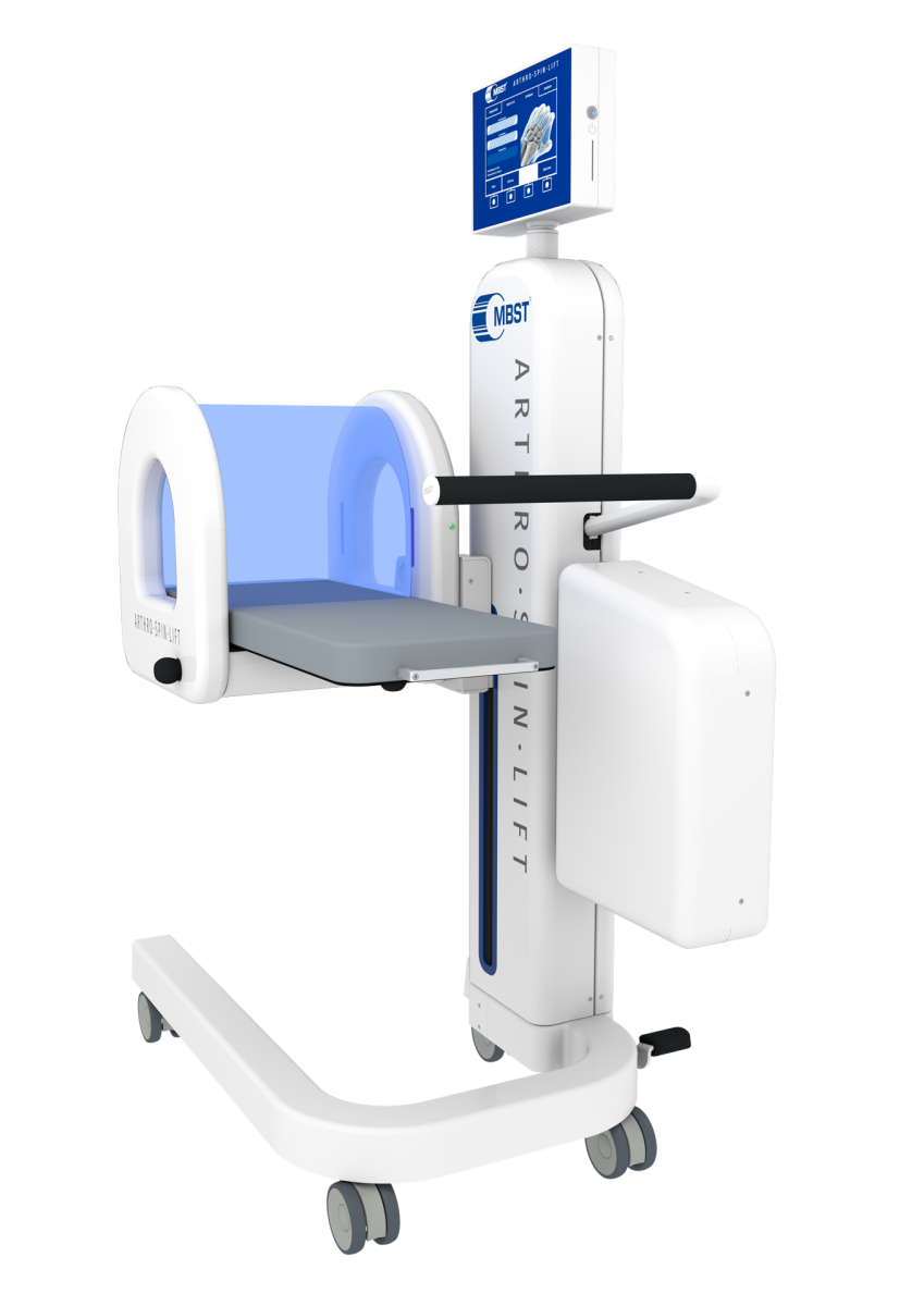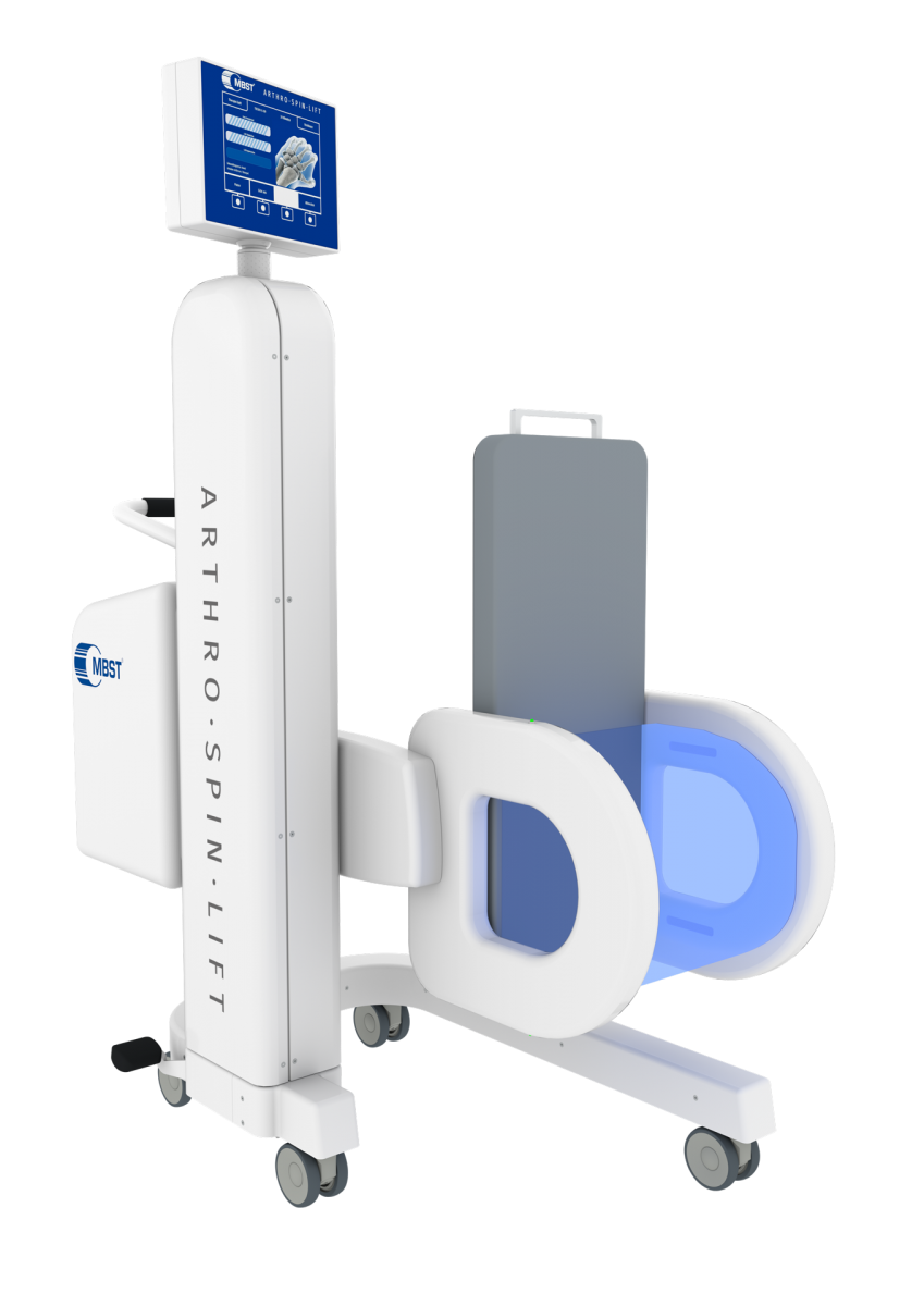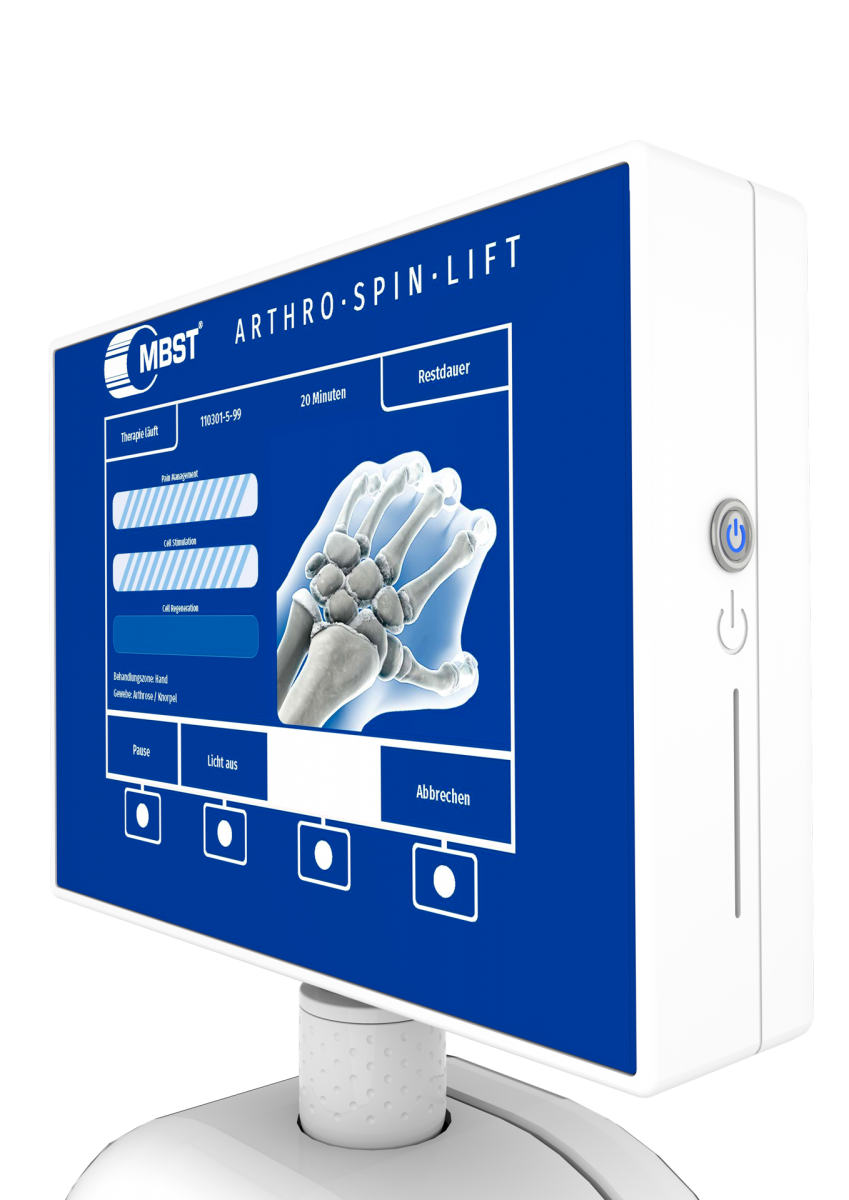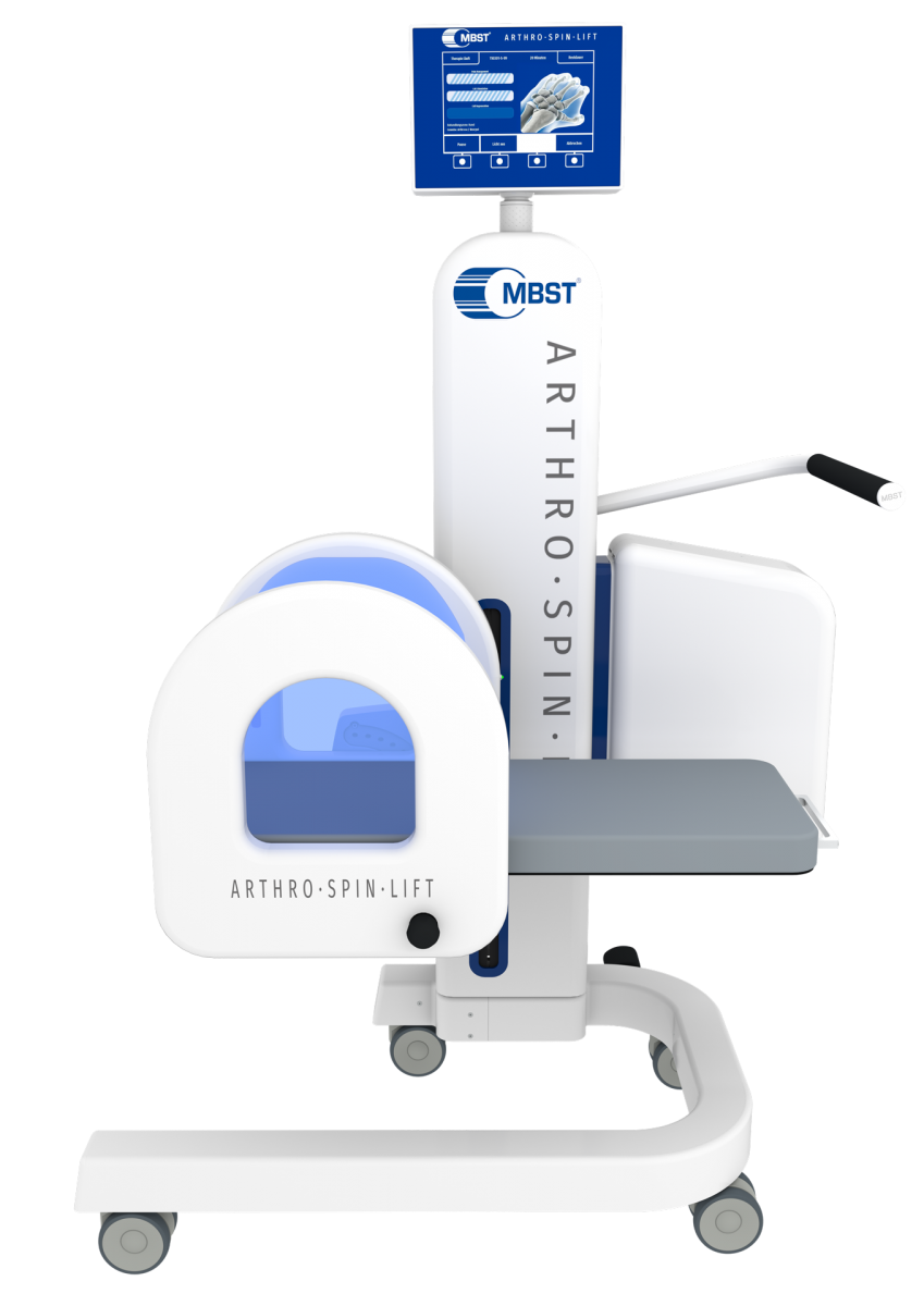 Het ARTHRO-SPIN-LIFT Therapieapparaat betreft hoogwaardige medische technologie. Het MBST-Therapieapparaat combineert therapeutische effectiviteit en patiëntcomfort met een uniek design en overtuigt ook in de dagelijkse praktijk door zijn functionaliteit, gebruiksvriendelijkheid, esthetiek en hygiënische aspecten. Met zijn brede scala aan te behandelen indicaties zet ARTHRO-SPIN-LIFT nieuwe maatstaven. Het therapiesysteem maakt een betrouwbare, behoedzame en veilige behandeling van een groot aantal degeneratieve aandoeningen en verwondingen van het bewegingsapparaat mogelijk. Bovendien wordt het gebruikt bij aandoeningen van het botmetabolisme en om genezingsprocessen te versnellen. Dit maakt het een ideale aanvulling op postoperatieve, post-intramurale en revalidatie-begeleidende behandelstrategieën voor verwondingen en aandoeningen van het bewegingsapparaat.