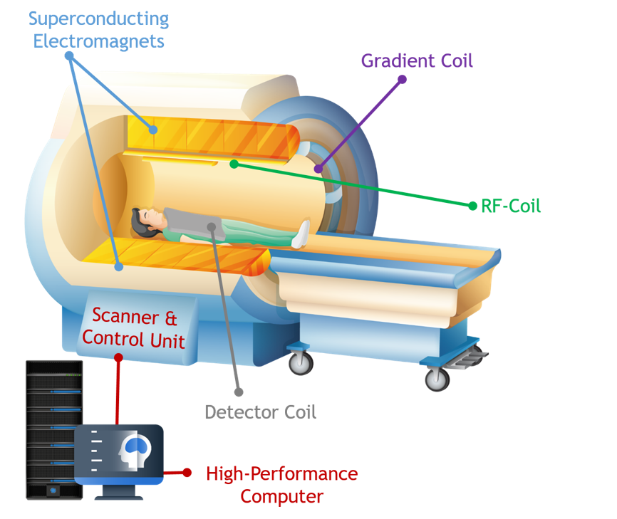 Een MRI-scan/-opname van bijvoorbeeld het onderbeen laat heel duidelijk verschillende details zien, zoals het enkelgewricht, het scheenbeen, de kuitspieren, de achillespees of de huid. Dit detailniveau wordt bereikt door een verscheidenheid aan MRI-beeldreeksen en een exacte beoordeling van de gegenereerde beelden om weefselspecifieke kenmerken & verschillen voor diagnostische doeleinden te benadrukken. Voor de totstandkoming van die daadwerkelijke MRI-scan (en die reeks aan verschillende MRI-scans) worden de protonen in de waterstofatoomkernen in alle weefselsoorten van het lichaam geadresseerd, om hiermee een scherp, contrastrijk beeld door de gespecialiseerde MRI-apparatuur te laten genereren.